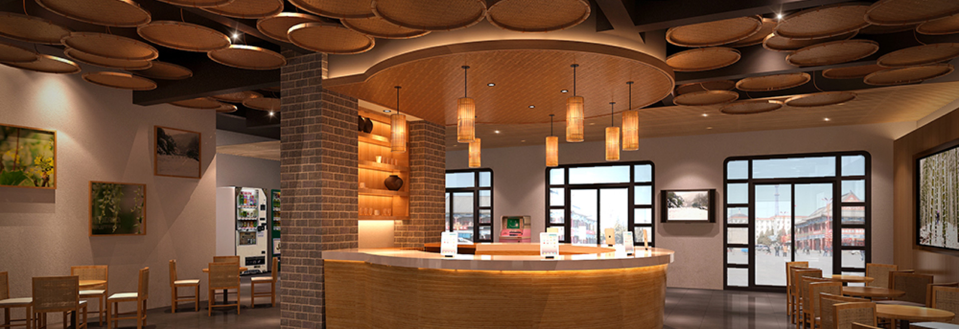 柔和光線背景下的幾何藝術圖案衍生成超級逃逸和空靈的畫面形象,激發更深層次的冥想。天花裝飾采用竹裝飾板手工編織,體現了展館的自然精神和終極美學。